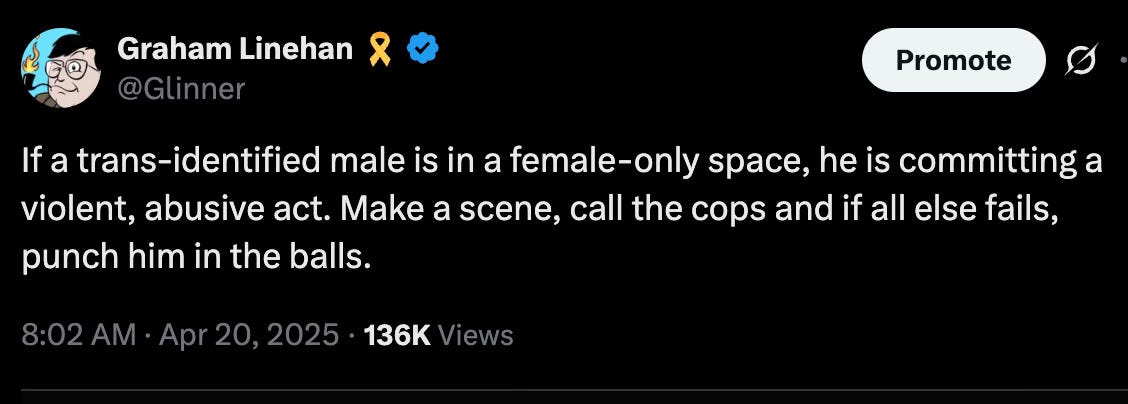 This is a short post to explain why it’s a short post — the answer being because when Graham Linehan was arrested on the tarmac at Heathrow last week for three tweets, I was immediately pretty sure who was behind it. And my suspicions were confirmed in open court — the report about Graham’s supposedly criminal tweets was made by a disgraced former police officer and trans-identifying man called Lynsay Watson, who ever since he was sacked by Leicestershire Police in 2023 for gross misconduct has made what appears to be a full-time job out of putting in false crime reports against gender-critical campaigners, and seeking to judicially review any police force that declines to take them seriously.