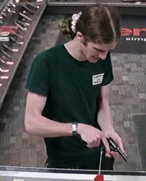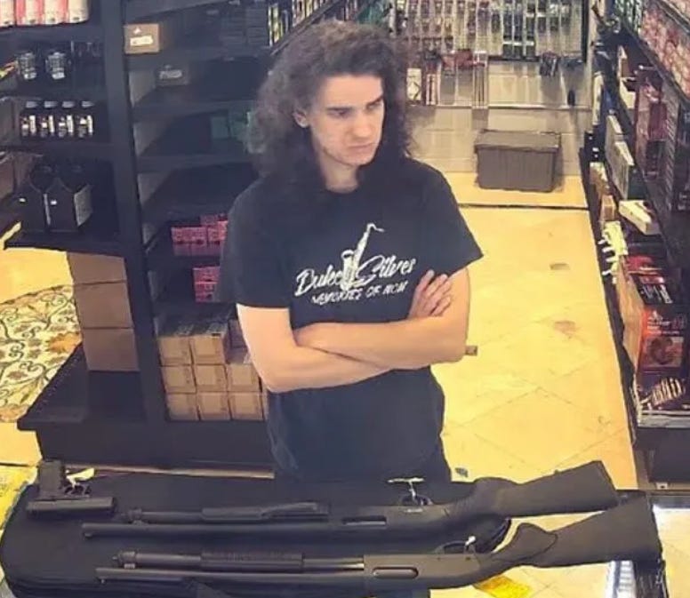 Nicholas is pictured above at a gun store. He resembles, and not just slightly, another man who purchased weapons and then shot up a church—the recently forgotten Robert “Robin” Westman.