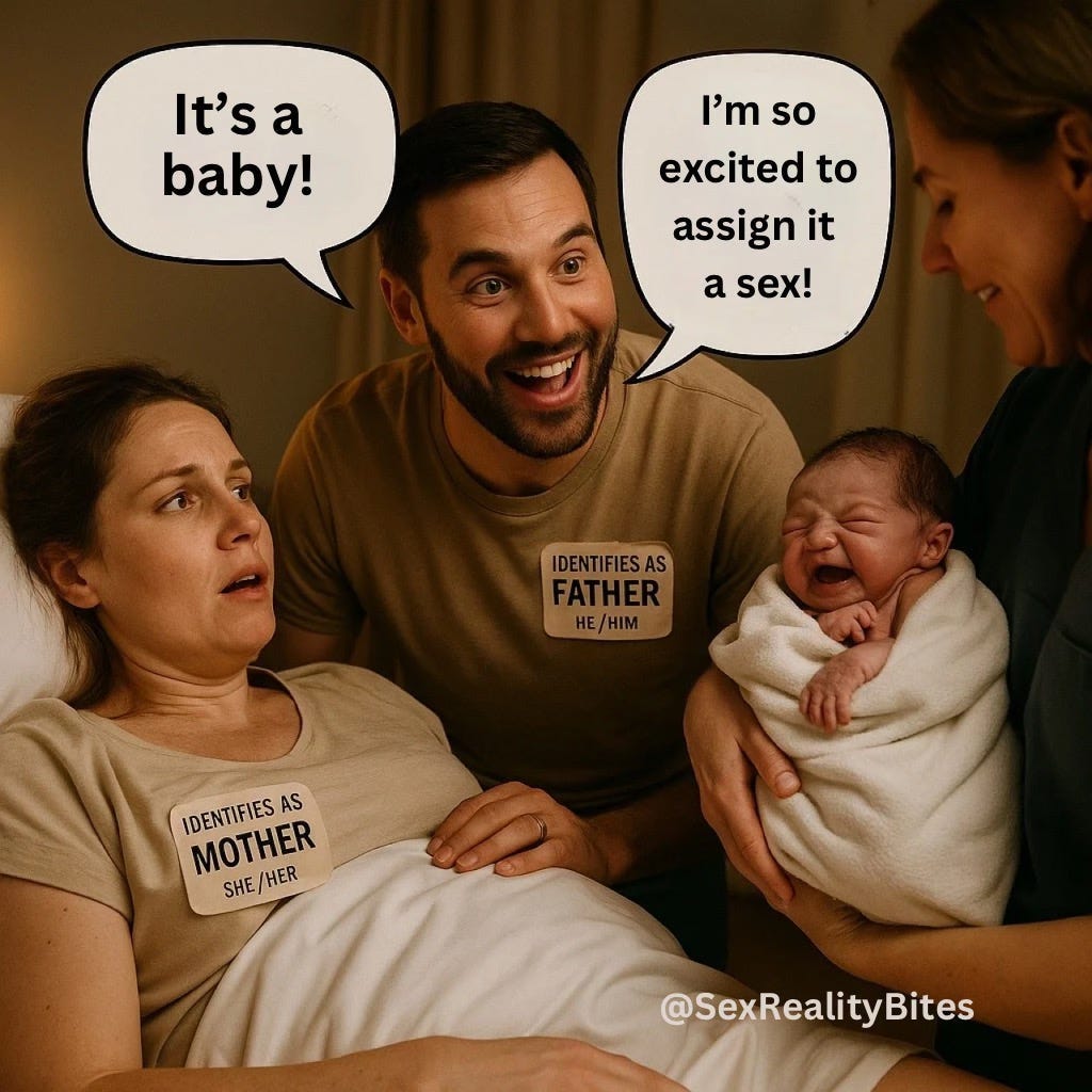 I created this image to capture how the birth of a child is increasingly filtered through the language of gender identity ideology in birthing and hospital settings— the name tags are exaggerated, the policies aren’t. In my post I write “pronouns might as well be mandated name tags” and that’s what was inspiration for this comic. The speech bubbles are there to show how terms like “assigned sex at birth” and ideologically-driven gender-neutral welcomes distort to absurdity what should be a simple, human moment.