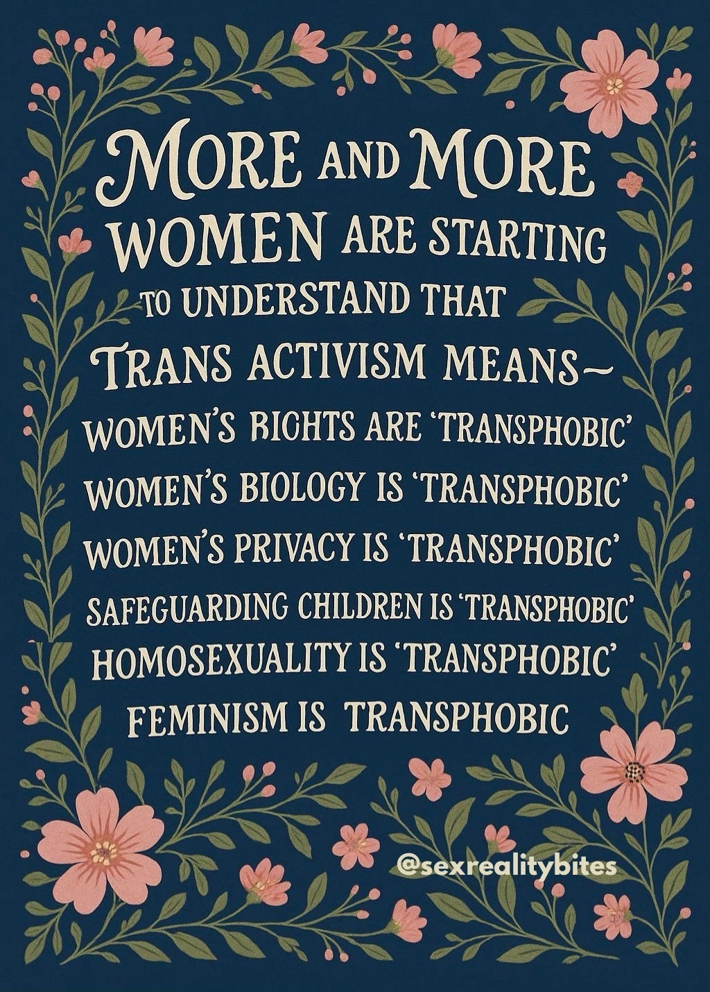 I was inspired to use the words (in the above poster) from a post by a user on X called @FLUMMOXXED that was being shared far and wide by sex realist women. I recreated them prompting vintage florals and lettering style honouring Suffragette banners using ChatGPT and Photoshop