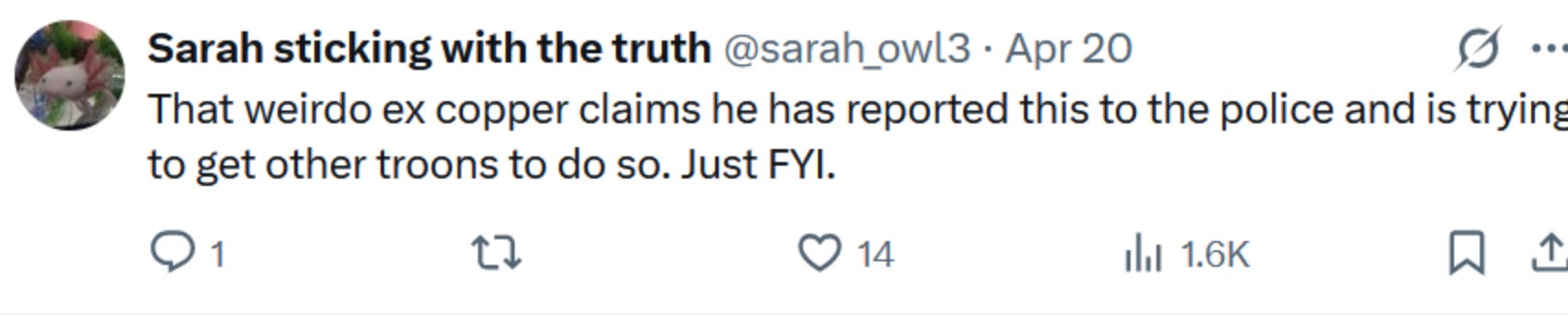 Epilogue: At one point, I said “I bet I know who made this complaint. Lindsay Watson” (demented ex-copper troon who was fired for his online conduct). Then, lo-and-behold, one of my lawyers sent me this reply to the ‘bollocks’ tweet.