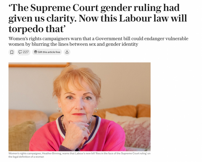The article includes Heather Binning’s view, that the new law will essentially introduce gender self-identification “through the back door”, which “flies in the face of the Supreme Court ruling,” she says. “It will be mayhem if it goes through as it is. If official documentation says a man is a female with the new system, employers and others will be inclined to accept it. This part of the Bill needs to be scrapped.”