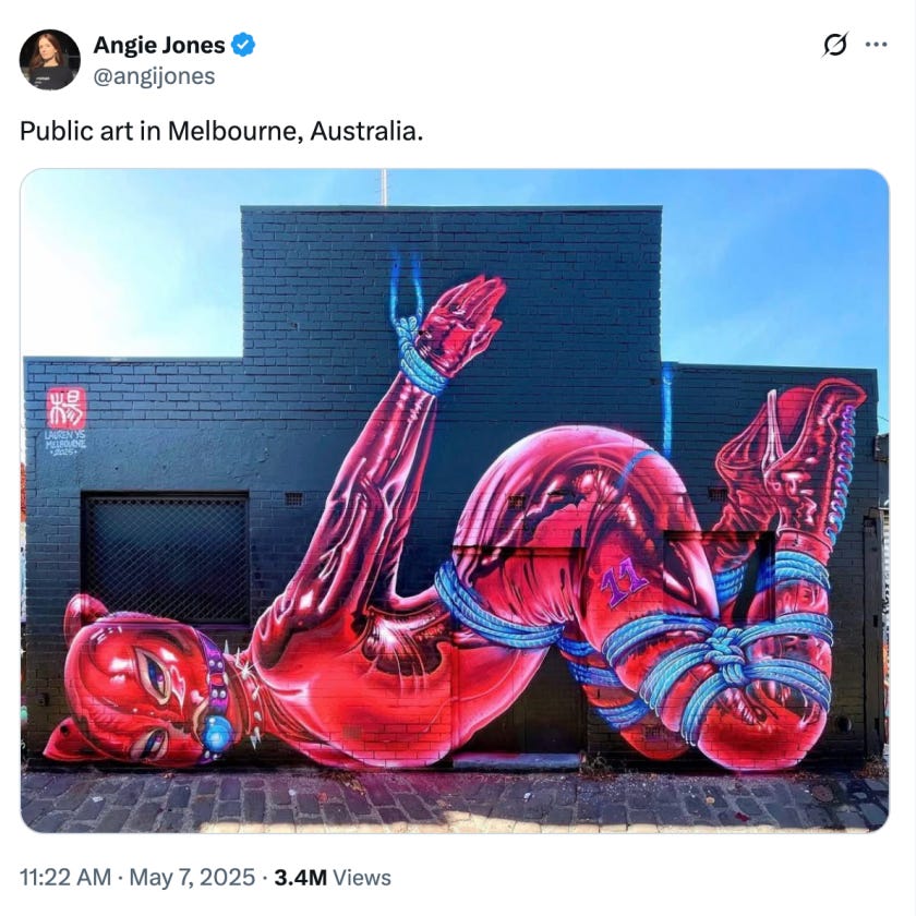 A new public mural in Fitzroy, Melbourne depicts a woman in BDSM fetish gear gagged and bound with ropes.