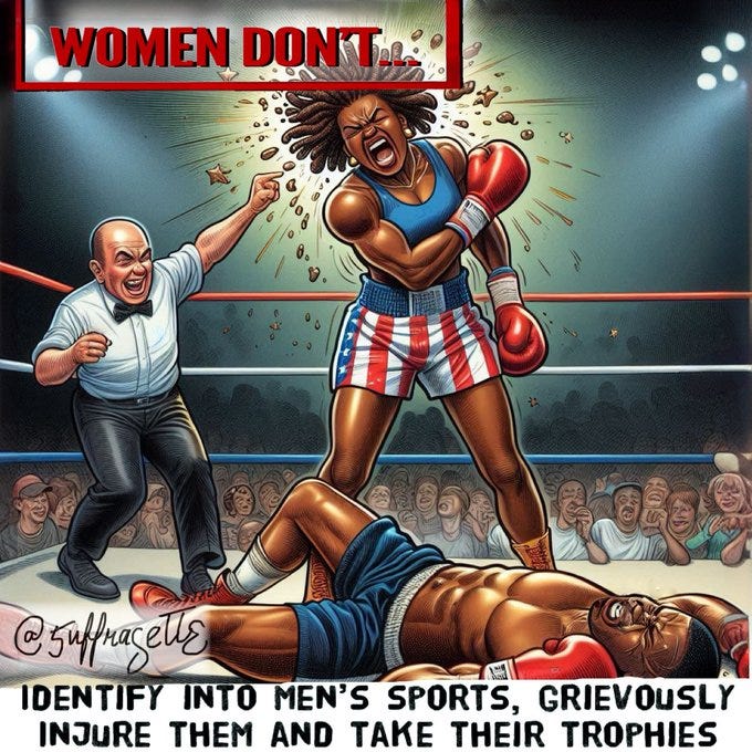 Never again should women be forced into the boxing ring to face athletes who have failed “gender verification tests” at previous competitions, nor lose out on selection for the Games because a sports federation allows trans-identified males to take their place, nor should males ever again take the kudos and wealth that comes from winning Olympics medals because they are “female in their passport.”