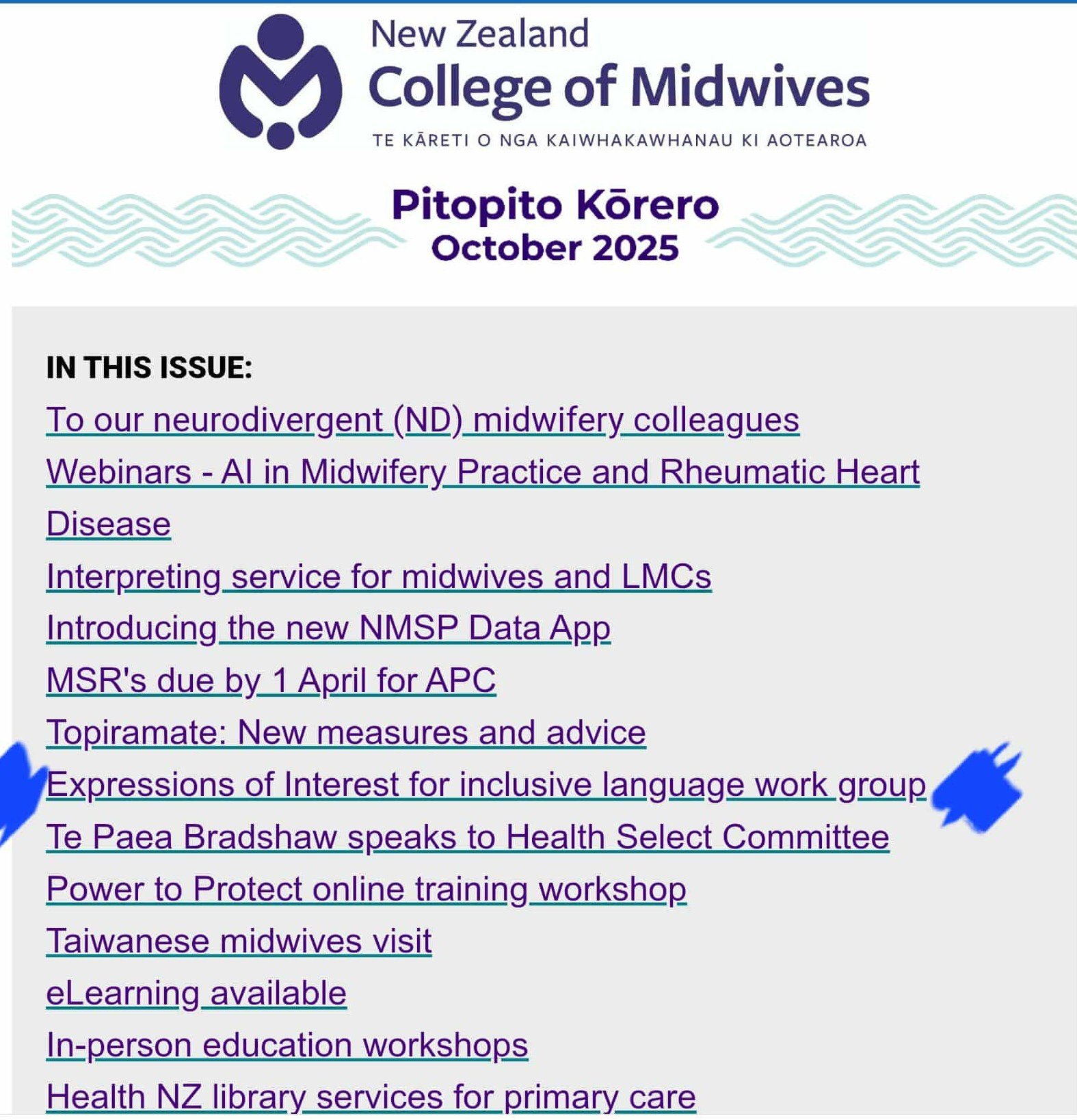 There it was. Smack-bang in the middle of the list of news items in the NZ College of Midwives’ October newsletter, was the request for “expressions of interest for an inclusive language work group”. It’s the best spot for something you have to make known, but really don’t want too much attention paid to.